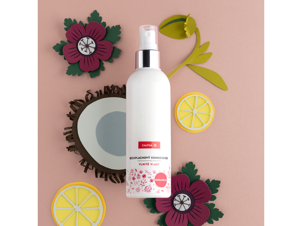 Blahodárné účinky jojobového oleje znaly už indiánské ženy – používaly ho k pěstění pleti i vlasů. V kondicionéru Caltha pomáhá zacelovat konečky, dodává vlasům pružnost a lesk a zároveň chrání před vysušením. Geránium působí proti tvorbě lupů, podporuje prokrvení vlasové pokožky a reguluje maz, takže je vhodné pro suché i mastnější vlasy. Sametově jemná emulze obsahuje přírodní emulgátory a rostlinná změkčovadla, které vyhlazují vlasy, zabraňují jejich vysoušení a usnadňují rozčesávání. Panthenol vlasy hydratuje, regeneruje a dodává jim přirozený lesk. Kondicionér se neoplachuje a je ideální i pro kudrnaté, husté či dlouhé vlasy.