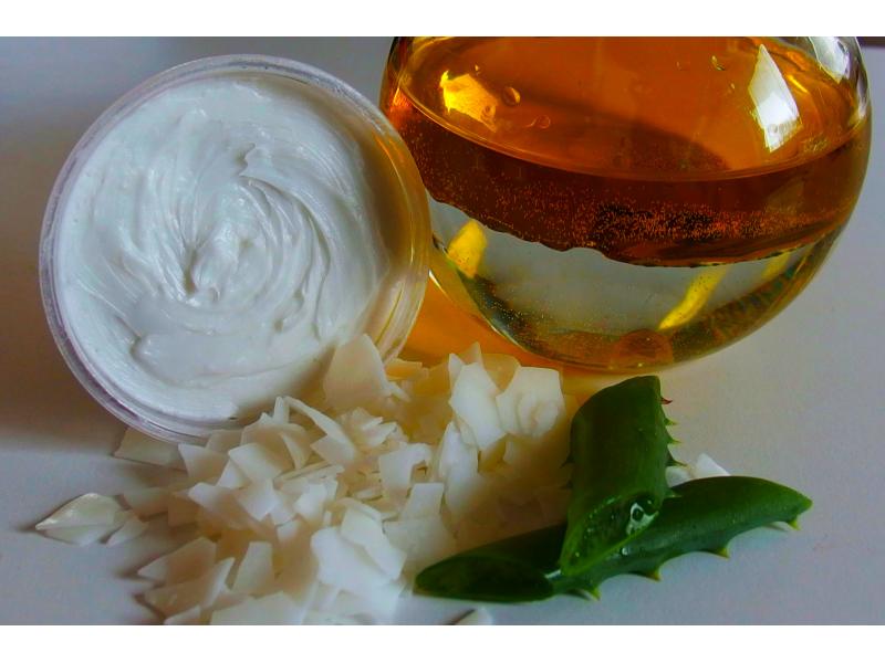 c. Emulgační vosky - já používám dva druhy přírodních emulgátorů - emulgátor získaný z olivového oleje a emulgátor z palmového oleje. Tyto emulgátory jsou v formě voskových šupin a dokáže spojit olejové a vodní báze s větším než 50% zastoupení vody. Tyto emulgátory pomáhají hydratovat pokožku, zajišťují jemnost krémů a jejih stabilitu.