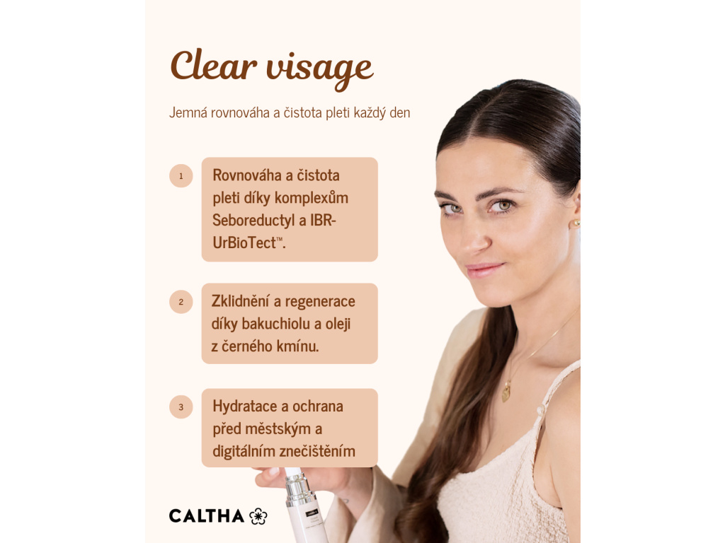 Clear Visage je luxusní přírodní krém s vysokým podílem BIO složek a klinicky ověřenými aktivními látkami. Lehká textura se rychle vstřebává, nezatěžuje a nezanechává mastný film, takže je vhodná i pro mladou a problematickou pleť. Obsahuje bakuchiol – přírodní alternativu retinolu, která redukuje vrásky, pigmentaci i akné bez podráždění. Kyselina hyaluronová ve vysokomolekulární i nízkomolekulární formě poskytuje intenzivní hydrataci, vyhlazuje pleť a podporuje její elasticitu. Klinicky testovaný komplex Seboreductyl reguluje tvorbu mazu a čistí póry, zatímco IBR-UrBioTect™ chrání pokožku před digitálním zářením a civilizačním znečištěním. Krém je obohacen o olej z černého kmínu, CO₂ šípkový extrakt, levandulový hydrolát a aloe vera v BIO kvalitě, které pokožku zklidňují, regenerují a dodávají jí vitalitu. Jemný pigment sjednocuje tón pleti a opticky zakrývá nedokonalosti.
