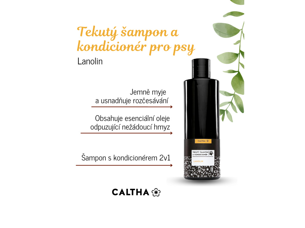 Tekutý šampon a kondicionér s lanolinem je ideální pro psy s dlouhou i krátkou srstí. Bohatá pěna jemně čistí a zároveň pečuje o srst i pokožku. Lanolin proniká do srsti, vyživuje ji a zanechává hebkou a poddajnou. Včelí vosk vytváří ochranný film, který chrání srst před nepříznivými vlivy a dodává jí přirozený lesk. Díky obsahu esenciálních olejů levandule a rozmarýnu šampon působí nejen osvěžujícím dojmem, ale také pomáhá odpuzovat nežádoucí hmyz. Složení je šetrné, bez umělých pěnidel, barviv a syntetických parfemací.